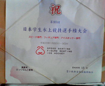 本日行われました第80回日本学生氷上競技選手権大会対東北学院大学の結果をお知らせ致します。 4-2で我々の勝ちでございます。 『ゴール』 青学 東北 1 0 2 2 1 0 ****** 4 2 『シュート』 青学 東北 8 5 12 9 12 9 ****** 32 23 『ペナルティ』 青学 東北 0 0 3 2 1 0 ****** 4 2 『ゴール・アシスト』 (1P) G荒関 A三村(勇) 佐藤 11’55 (2P) G宮川 A三村(勇) 27’30 G三村(拓) A高橋 28’12 (3P) G三村(勇) 32’20 『GK滞氷時間』 西山/45分 キャプテン高橋のコメントは後程お送りいたします。 今日の試合は、前半は青学らしさが出せず失点を重ねてしまったのですが、部員一同一丸となって戦った結果見事逆転勝利することができました。この波に乗って次の試合もいい結果が出せるよう全力で戦いたいと思います。お忙しい中お越しいただいたOBの皆様、心より感謝しております。今後ともご指導ご声援の程宜しくお願 いいたします。 尚、次回の試合は1月7日(月)8:00~白鳥アリーナにて、インカレ(第80回日本学生氷上競技選手権大会)対日本大学です。 PR 朝9時半に札幌を出発し、苫小牧入りをしました! 後半から合流の、MGあるてちゃん、みなみちゃん、まいくも無事到着しました♪代わりに前半で帰るみお、優ちゃんは今日でお別れ(;_;) うるっときてしまいました(;_;) 苫小牧は札幌に比べ雪が降っていない分暖かく感じます♪ 私たちの宿舎は、4つほど大学が集結しています! 洗濯機争奪戦になりそうですね(^o^; 夏ぶりの白鳥リンクは相変わらず私の好きな匂いがしました! 明日、あさっては10時~11時半、17時~18時半の時間帯で練習です! リンクの関係で今日・明日はオフ、2日に苫小牧へ移動です! 早いもので今年も最後1日になりました。 皆さんにとって2007年はどんな年でしたか? 青学ホッケー部は念願の2部優勝・1部昇格は果たせませんでしたが、チームとしての団結力は強くなった1年だったように感じます! 去年も年越し合宿だったので、ホッケーに始まりホッケーに終わるという皆と長い時間を共有できたからかな(*^_^*) 今日の夜は年越し飲みです!! 最後のしめくくりとして、思いっきり楽しみたいと思います(^3^)/ OB・OG、ご家族、友人、各関係者、ファンの皆様…本当に今年はお世話になりました。 来年も皆様のお力を借り、また声援を武器に精一杯頑張ることを誓いますので、どうぞ宜しくお願いいたします! 皆様にとって2008年がすばらしい年になりますよう、心からお祈り申し上げます。 青山学院大学アイスホッケー部 現役一同 カレンダー