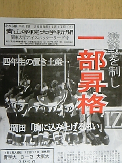 青学の体育会で1番有名なところといったら… なんといっても硬式野球部ではないでしょうか! 今日は神宮まで応援にいってきました! 主力選手が多数抜けてしまった今年の野球部はピンチで、専修と1部残留争い状態… そんな専修との直接対決でした。 1勝1敗で迎えた3日目。 序盤は青学が優勢で、9回表までは8ー3と5点差でこのまま余裕勝ちかな☆と盛り上がっていたら… 9回裏専修が怒濤の追い上げをみせて、8ー7まで追い付かれてしまったんです… 最後は青学のファインプレーで勝ちました☆ ほんとによかった(T_T) これで専修の入れ替え戦行きが決定したのかな… ホッケーの視点からいうと、去年の秋の2次リーグ、私たちは専修に負けて2部降格が決まったんだよなぁって思ったら、ちょっとだけ複雑(>_<) でもっ!うち今年は全勝優勝で1部昇格するのが目標なんで、ここからです(^3^)/ PR 今日は結団式がありました♪ その後にOB会長中西さんのご好意で、1年生との面会式が行なわれました♪ それまでの間、1年生は学校そばのマックで時間をつぶしていました! 就活帰りの私もそこに合流☆ そこでこんなかわいい写真が撮れたんです(*^^*) 結団式前に、MG優ちゃんが一発で取ったというバナナタラコ?とまつも(#10) いきなり撮ったから驚いた顔してるんだけど、それがもう…なんとも言えず… 萌え〜♪(笑) さて、中西さんとの面会式の場へ移動… OB会よりネクタイ・エンブレムを頂きました(^^) 皆嬉しそうにつけていました☆ ありがとうございます! 大事に使います☆ エンブレムを着けて皆にっこりと♪ …のはずが、ぶれぶれに…(^^;) お忙しい所、1年生に会いにきてくださった中西さんには本当に感謝の気持ちでいっぱいです! こちらのブログも見てくださっているというお話を伺ったので、今日の分も読んで頂けていたら嬉しいです♪ 皆さんにご報告があります☆ MGに新しい仲間が増えました〜♪ 高野 真衣ちゃんです☆ 記念にぱちり☆ しづ&真衣 明日も25:15分〜東伏見で練習です!! 青学の体育会は年に2度、体育会全体集会のようなものがガウチャー(教会)で行われます。 5月に1年生体育会入会式&東北学院定期戦結団式、年末(だったかな?)に体育会総会があります。 かなり厳粛な雰囲気の中行われます! 明日は一つ目の集会が! 1年生にとっては初めての経験です☆ 時間も結構長いし、静か~な感じなので、かなり睡魔にやられますが…笑 みんな頑張って起きて耐えてねo(^-^)o 今日部室に行ったら、義昭(#77)と、久保ちゃん(#79)に遭遇♪ 「自主的にウエイトしてきちゃったよ~」って義昭が♪ 嬉しいなぁ(^^)v 応援してるよー☆ 私は明日面接に臨んできます! ぞくぞくと決まってきてるタメの選手に続いて、私も早く朗報をお伝えできるようがんばります(^3^)/ 5/7(MON) 今日はOBの林さん('07卒)のお誕生日です♪ おめでとうございます☆☆ お仕事忙しそうですが、体に気をつけてがんばってくださいね(^^) 今日から練習再開♪ 東伏見なので私は自粛です(;;) 早いとこ引っ越そうと思います♪ 今日は就活で筆記試験を受けていたんですが、不覚にも思い出し笑いをしてしまいました!! しーんとした部屋で、「ぷぷっ」って…。 さすがに恥ずかしかったです(笑) そして、部室をちょっと綺麗にしてきました♪ 満足したらその場で爆睡しちゃいました(笑) みんな部室綺麗に使ってね〜♪ 林さんのお誕生日を記念して… 一部昇格した時の新聞♪ 3点目林さんが決めて同点に追いついたんです(*^^*) 次のお誕生日は 5/11 OB小島さん('05卒)です♪ カレンダー
