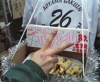 3日・5日と学祭の出店を終え、今日は打ち上げでした(^3^)/ 参加メンバーは… 義昭、みむ、一生、ほりピー、久保くん、岩ちゃん、塚ちゃん、勇人、白倉くん、しづ、優!! まった~り飲んで一次会終了!! 一応解散になったはものの…みんなホッケー部大好きだから一人も帰る気配なし(笑) デザートにアイスを食べたのですがまだ食べたりなくて皆でサーティーワンでアイスを食べることに♪ おいしかったぁ♪ そのあとはゲーセン組み、帰宅組み、飲み組みに分かれることに… 義昭、みむ、一生、しづ、優でにじゅうまるへ!! ボトルいれちゃいました~(笑) ここでもシメはアイス!!本日3回目~(笑) さて、ちょっと先の話ですが今年のインカレ合宿は12月の28日からになりました! 去年に引き続き今年も年越し合宿☆ わぁい☆楽しみです☆ PR 昨日行われました平成19年度関東大学アイスホッケーリーグ戦対立教大学の結果をお知らせ致します。 8-1で我々の勝ちでございます。 『ゴール』 青学 立教 3-0 3-0 2-1 ******* 8-1 『シュート』 青学 立教 16-4 14-6 6-14 ******* 36-24 『ペナルティー』 青学 立教 3-3 2-2 4-1 ******* 9-6 『ゴール、アシスト』 (1P) G堀内 A松本 06’38 G宮川 07'09 G園田 A堀内 13’28 (2P) G荒関 17’20 G荒関 A三村(勇) 17’46 G園田 19’09 (3P) G高橋 A荒関 36’49 G三村(勇) A荒関 39’26 『GK滞氷時間』 西山/39分39秒 渡辺/05分11秒 キャプテン高橋のコメント 「今日も勝利することができ、一次リーグを一位で通過するのが現実のものとなりそうです。チームワークも以前より良くなり、このまま二次リーグを戦い抜きたいと思います。OBの方々にはいつも寄付を頂いており、本当に感謝しております。いただいた寄付は大事に使わせていただきます。」 昨日の試合は、序盤から青学のペースで戦うことが出来ました。一次リーグも残り1試合となりましたが、残り1試合も勝利できるよう、油断することなく全力で練習に励んで参ります。今後とも皆様のご指導、ご声援の程、宜しくお願い致します。 尚、次回の試合は11月10日(土)19:30~東伏見ダイドードリンコアイスアリーナにて、平成19年度関東大学アイスホッケーリーグ戦第六戦対国士舘大学です。 ホッケー部の写真追加しました!!(mixi) 春合宿の模様を載っけています♪ ぜひご覧下さい♪ http://mixi.jp/view_album.pl?id=6988095&mode=photo 最近毎日すっごく忙しくて、今日久しぶりにパソコンひらきました(><) 更新できなくてごめんなさい!! さて、昨日は青祭初日でした♪ 場所もよかったしかなりの大繁盛!!!! ほりピー(#14 )作のれん♪ うまいですよね(*^^*) お店はこんな感じ!! 下にある看板は勇人(#91)作♪ 皆、絵上手なんだね〜♪ さらにビックリうれしいことが!! 一生(#29)が焼き鳥Tシャツを作ってくれたんです!! しかも背番号入りー♪ お店番をしている選手の後ろ姿とTシャツ☆ 左から久保くん(#79)、塚ちゃん(#44)、白倉君(番号ナイショ笑)、メガちゃん(#51) 焼き鳥担当は主にほりピー(#14) バイトでも焼いているみたいで、すごく慣れていました♪ 看板娘の1年生優ちゃんと♪ 隣のお店の人、陶器の銅像みたい…(笑) 色々な工夫をして客引きもしましたよー♪ さぁ、誰の手でしょう?!(^^) 明日もお昼までやっているので、お時間ある方はぜひ遊びにきてくださいね♪ 今日の立教戦は8-1で勝つことができました☆ 明日詳細UPします♪ 昨日はコーチの岡田さんが練習に参加してくださいました♪ 私の2つ上の先輩なので、2年間チームメートでした。当時から大ファンなのですが、今でもいつ会っても素敵な方です(*^_^*) 明日は青山祭準備、あさってはとうとう本番です♪ 私は江國香織さんの小説がすごく好きなのですが、今読んでいるホリー・ガーデンという作品の中で『アイスホッケー』という単語がでてくるんです! ルールが難しいスポーツという局面でですが…笑 確かにホッケーって、初めてみるとワケわからないですよね(;^_^A 私も初めてみたとき、『アイシング』をチーム名だと思っていました笑 でもみたら確実にハマる。そんな魅力がたまらないんですけどね♪ 皆さんもアイスホッケーまだみたことないというお友達を連れて、ぜひ観戦にいらしてくださいね(^3^)/ カレンダー